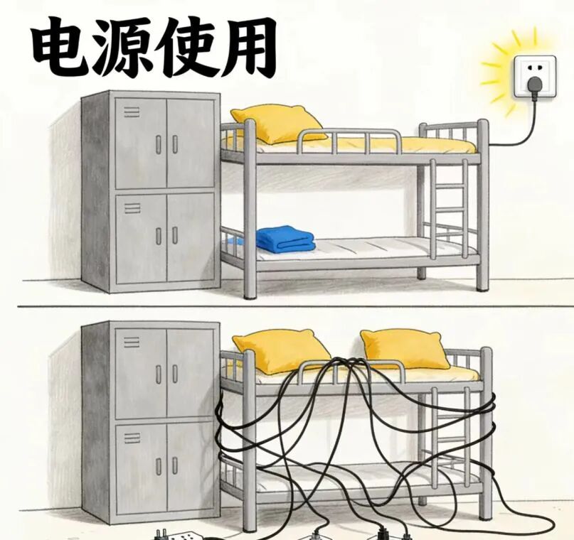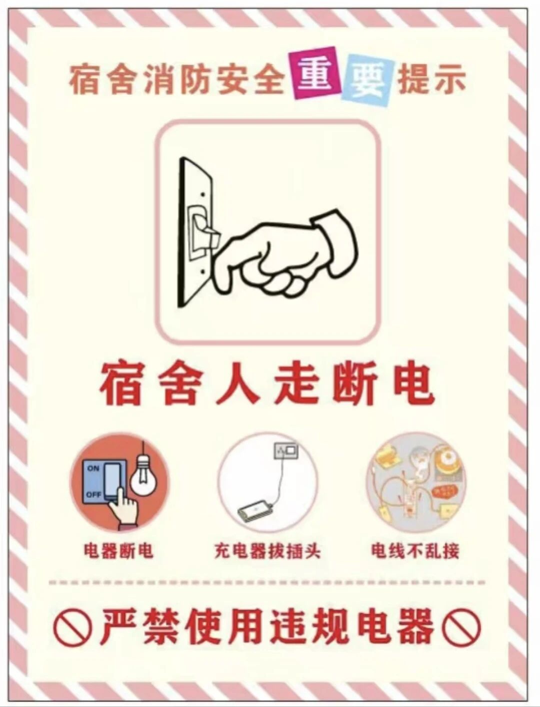 这是宿舍用电安全的基本原则。当同学们离开宿舍时,要关闭所有电器的电源,包括电灯、插座等。不要让电器处于无人看管的待机状态,以防万一。