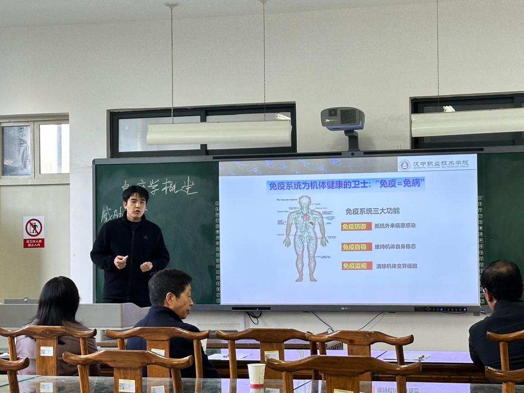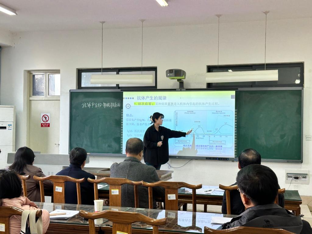 近两年入职的4名教师进行了教学展示。李子微老师以《细菌的革兰氏染色》为主题,从实验原理切入,拆解涂片、干燥、固定等关键步骤,对比革兰氏阳、阴性菌细胞壁结构差异,阐释染色结果核心原理;黄颖老师围绕《胰腺位置形态与组织结构》,借解剖图谱讲解胰腺基础结构,结合胰腺炎案例分析结构与病理关联,引导理论对接临床;王李格老师主讲《抗体产生的一般规律及应用》,以初、再次免疫应答差异为核心,用折线图呈现抗体曲线,解析记忆细胞形成机制;李雪峰老师在《免疫学基础》教学中,以免疫应答过程为主线,引导学生梳理核心环节,结合疫苗研发案例具象化理论,调动学生参与积极性。