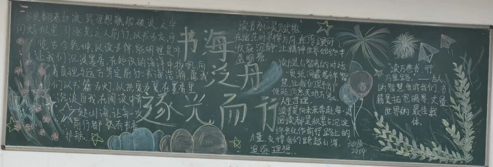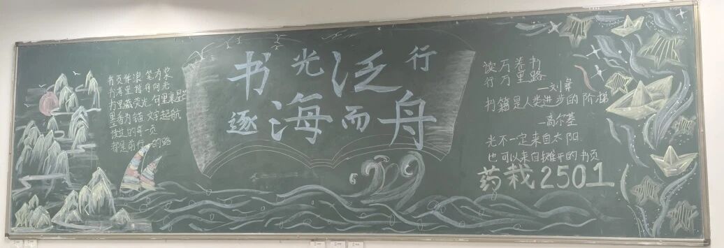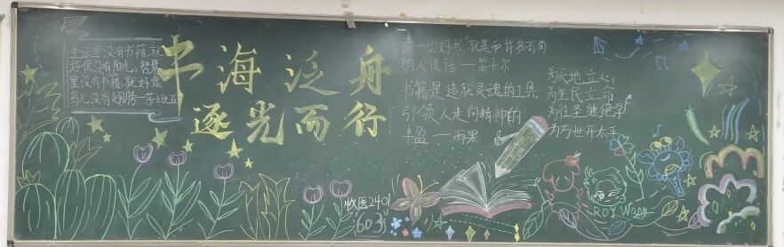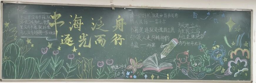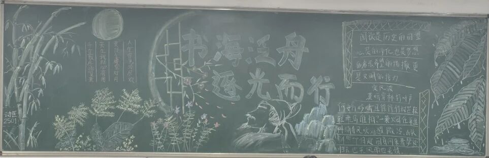 各支部团支书精心准备讲解PPT,助力同学们深入理解团会内涵,积极参与学习交流。随后,为让“书海泛舟,逐光而行”的主题浸润人心,各班级板报小组巧思设计、用心绘制了主题黑板报,成为教室里一道亮丽的风景。尽管风格各异、构思不同,但都将“以书为舟,向光而行”的信念,绘成了空间中最为动人的视觉语言。